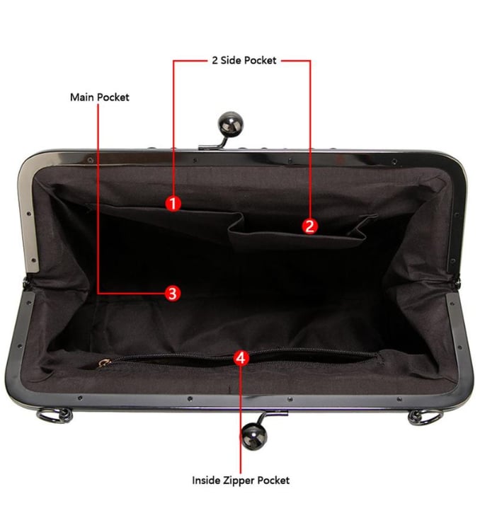 - The bag is 21.5 cm high, 28 cm wide, and 8 cm deep, and features a detachable handle, a kiss-lock closure, and heavenly relief patterns. This bag is sturdy and made to last.