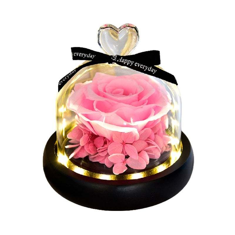 The transparent glass dome, pearls with rose, small fruit pieces and plush toys, embedded immortal rose, and the crystal heart-shaped design of the dome shows purity.