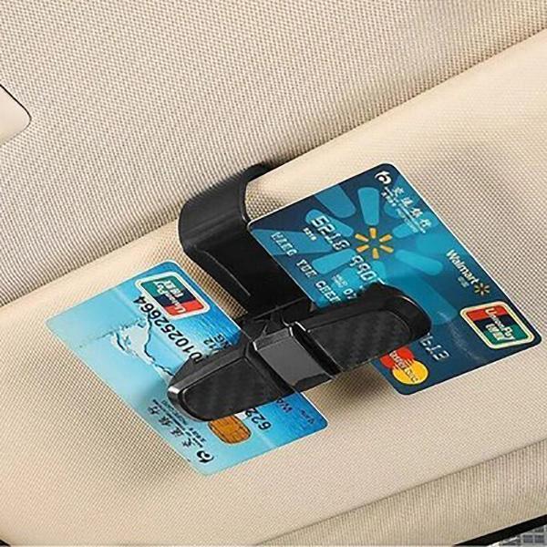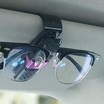 This glasses holder for car sun visor, enables two pairs of glasses and an extra card to be clipped tightly due to it has a double-ended clip.