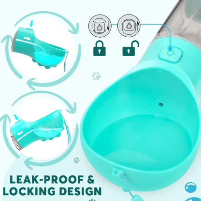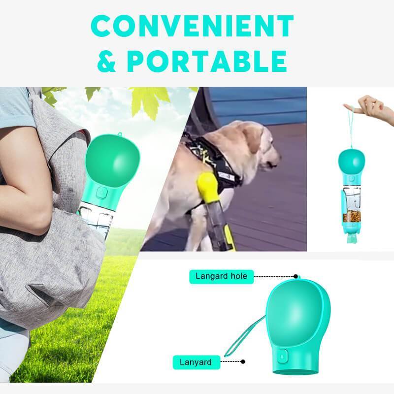 4 In 1 Combination Dog Water Bottle This dog water bottle is an upgraded design bottle. It consists of a water cup, food storage cup and a scoop. It also comes with 15 handy pouches as a gift. It helps your dog to drink easily and you can feed him whenever and wherever you want. You can use the spatula to clean up your dog's excrement and put it in the handy pouch included.