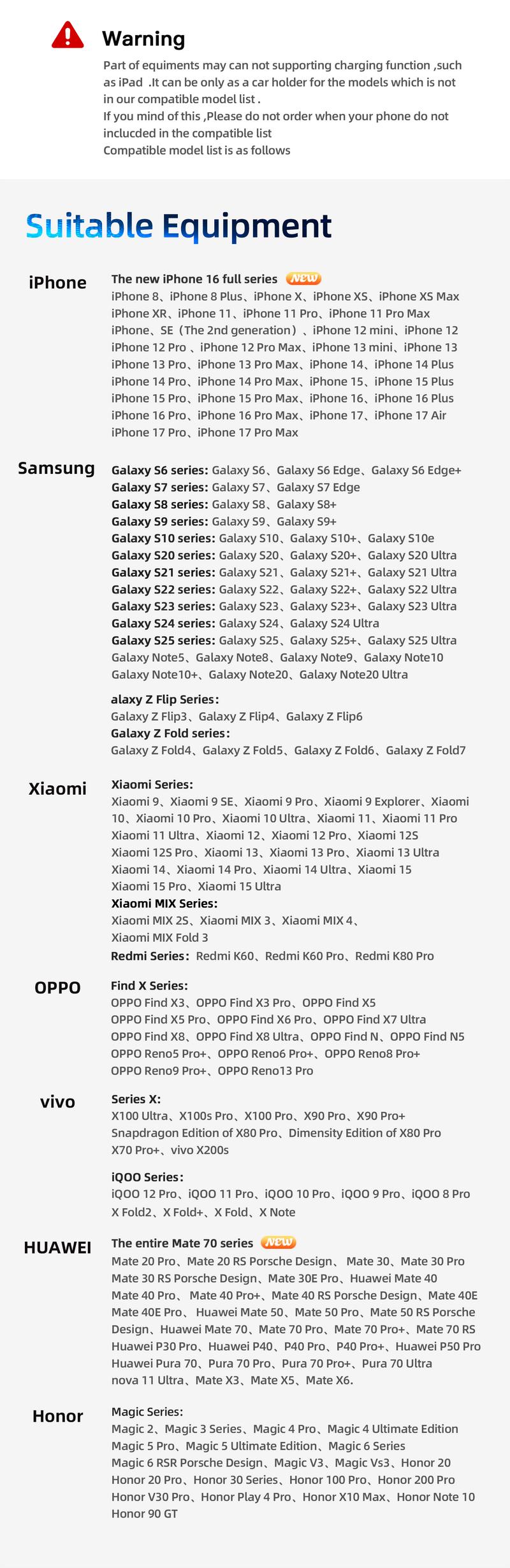5.This devices wireless charging function not working on all the models ,compatible models in the list