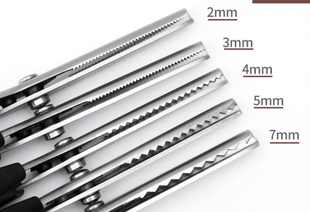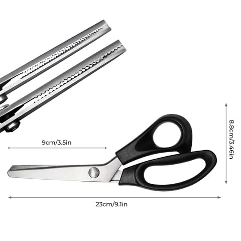 VERSATILE PUNCHING SHEARS – The sharp blades are serrated, leaving a zigzag pattern when cutting. This serrated pattern limits the length of frayed threads on unfinished fabric edges, minimizing damage.