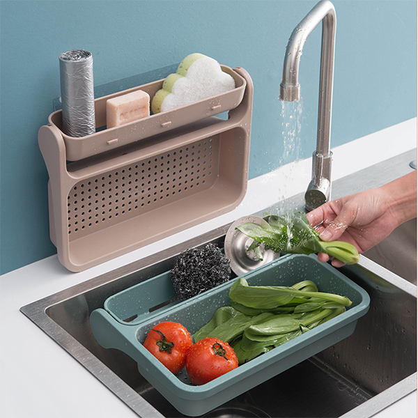 A multi-functional water basket for washing vegetables, sink shelf and water basket for washing vegetables.