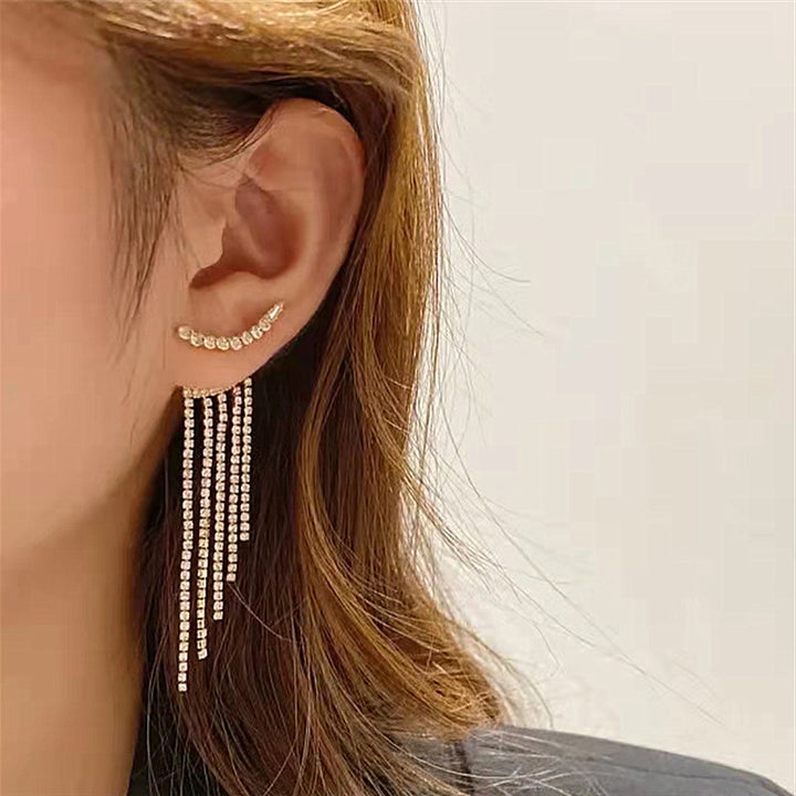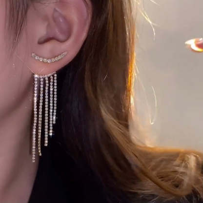 Package Includes: 1 pair * Sparkling Curved Rhinestone Long Tassel Earrings