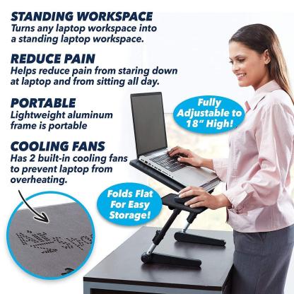Need a multifunctional laptop workstation Or a TV tray for food/snack. Even a bed tray desk to enjoy your breakfast. We have them all over. This Green Pro adjustable aluminum laptop notebook table features air vented cavities design which reduces overheating on your laptop/notebook.