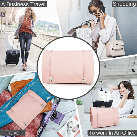 This toiletry bag can be rolled up and secured for easy carrying, making it ideal for travel, vacation, business trip, gym, camping, or daily storage.