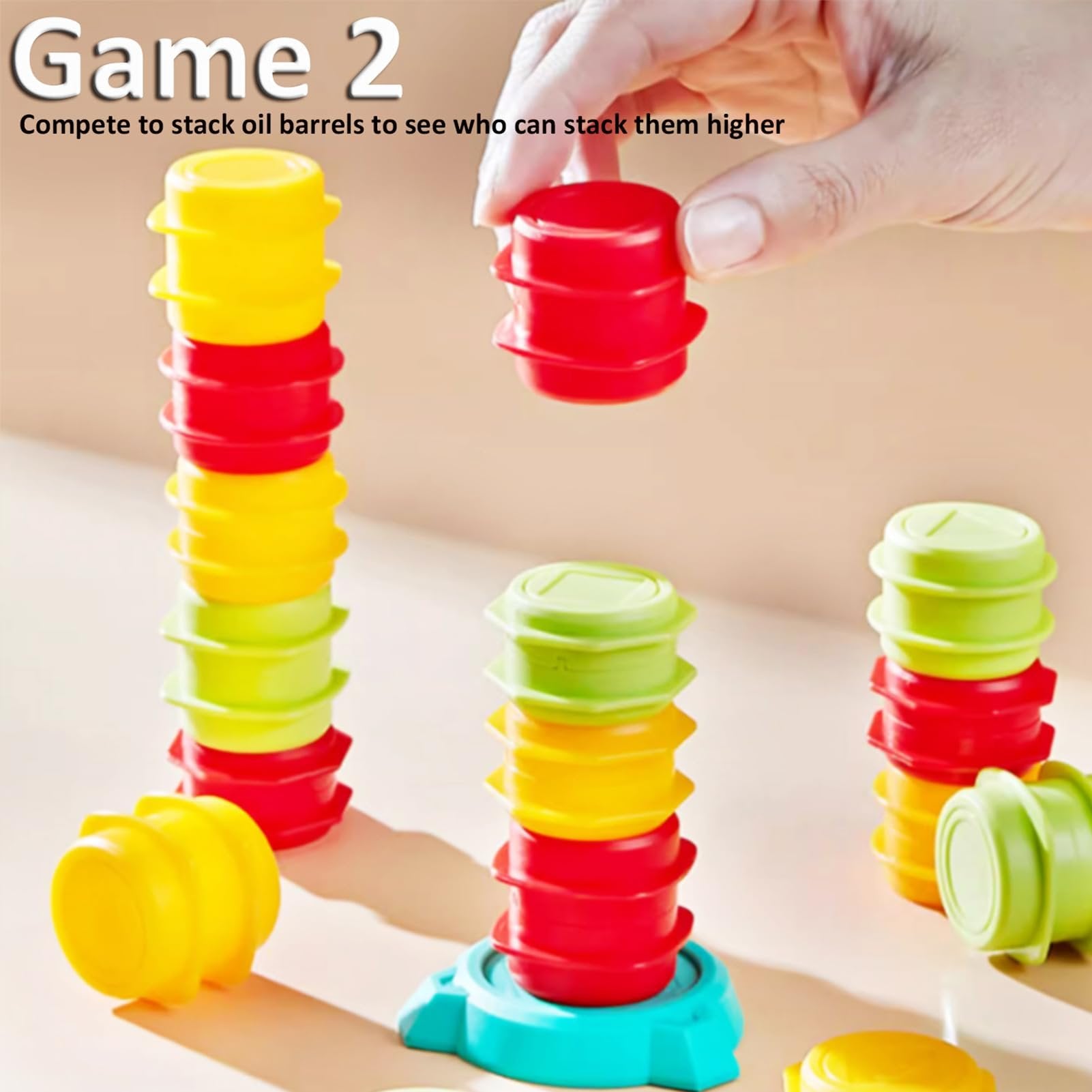 【How to Play】: Game 1: Simple and easy to play, randomly turn over the cards, stack the oil barrels according to the cards, transport the oil barrels to the designated location, put down the oil barrels, whoever runs faster wins. Stack the oil barrels according to the cards and transport them to the designated location, press the bell to win! Game 2: See who can stack the oil drums higher!