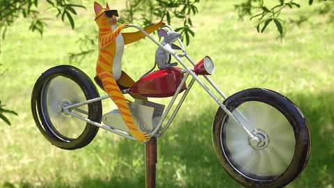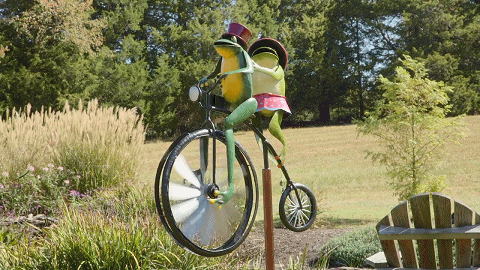 The spokes of his enormous front wheel will spin in the breeze and cause his legs to move up and down in a peddling motion.