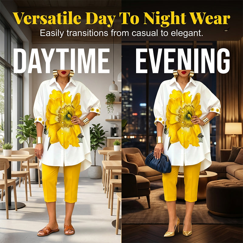 FLATTERING OVERSIZED SILHOUETTE DESIGN - Designed to flatter every figure, the relaxed oversized shirt pairs perfectly with tailored capri pants, creating a beautifully balanced silhouette that moves gracefully with you.